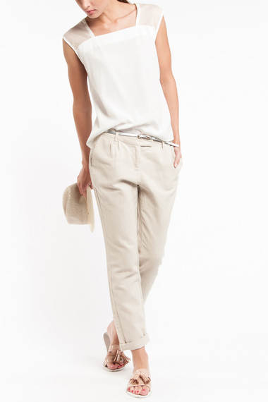 Бежевые льняные брюки прямого кроя. Модель с втачными карманами по бокам, классической застежкой на молнию впереди и шлевками на поясе под ремень.