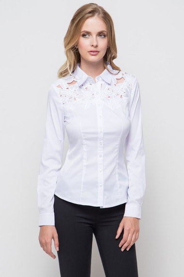 ОписаниеКрасивая белая блузка с длинными рукавами, приталенного кроя. Модель украшена большими цветочными аппликациями на плечах.